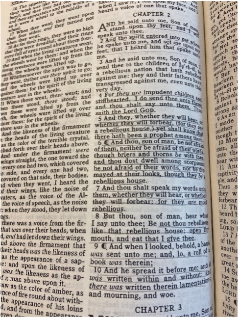 I opened my Bible, and this time it opened to Ezekiel Chapter 2 (picture taken). “They are impudent children and stiffhearted. I do send thee unto them; and thou shalt say unto them, Thus saith the Lord God. And they, whether they will hear, or whether they will forbear (for they are a rebellious house), yet shall know that there hath been a prophet among them.